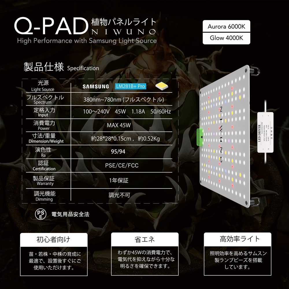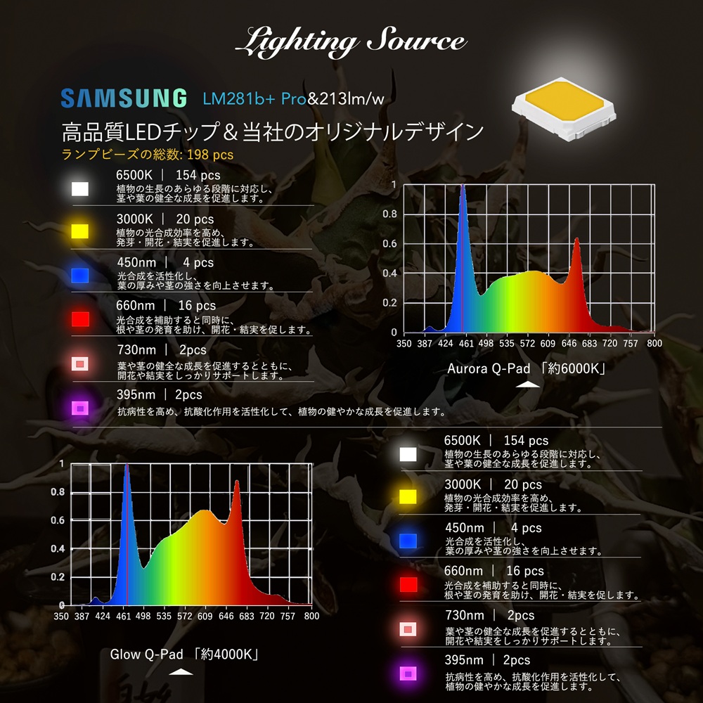高性能なSAMSUNG製「LM281B」LEDチップを搭載し、光合成有効放射量(PPF)の最大化を実現しました。さらに、UV-A(紫外線)、IR(赤外線)、660nmを含むフルスペクトルLEDにより、屋外環境に近い光を再現し、植物の成長を強力にサポートします。