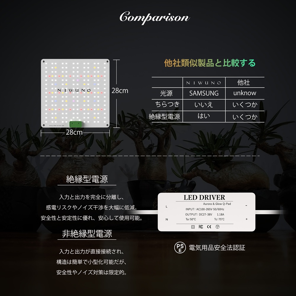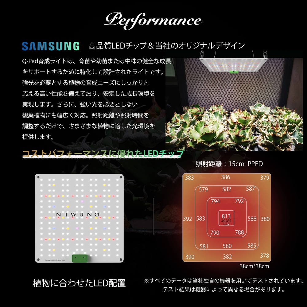 【高性能SAMSUNGチップ】高性能なSAMSUNG製「LM281B」LEDチップを搭載し、光合成有効放射量(PPF)の最大化を実現しました。さらに、UV-A(紫外線)、IR(赤外線)、660nmを含むフルスペクトルLEDにより、屋外環境に近い光を再現し、植物の成長を強力にサポートします。