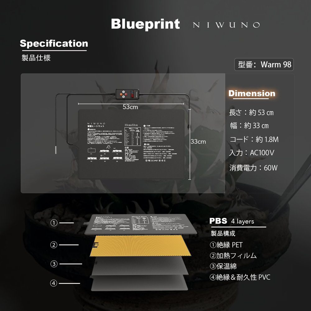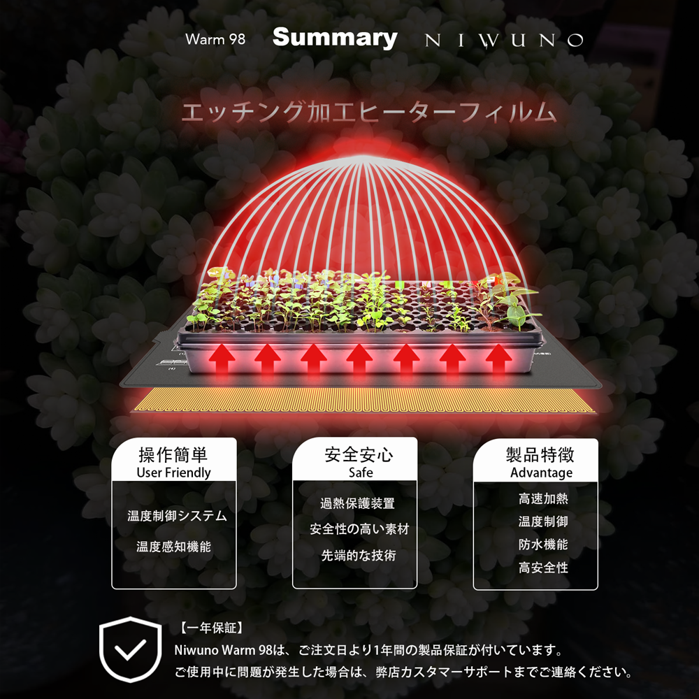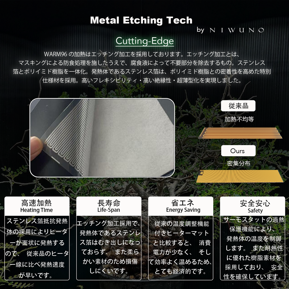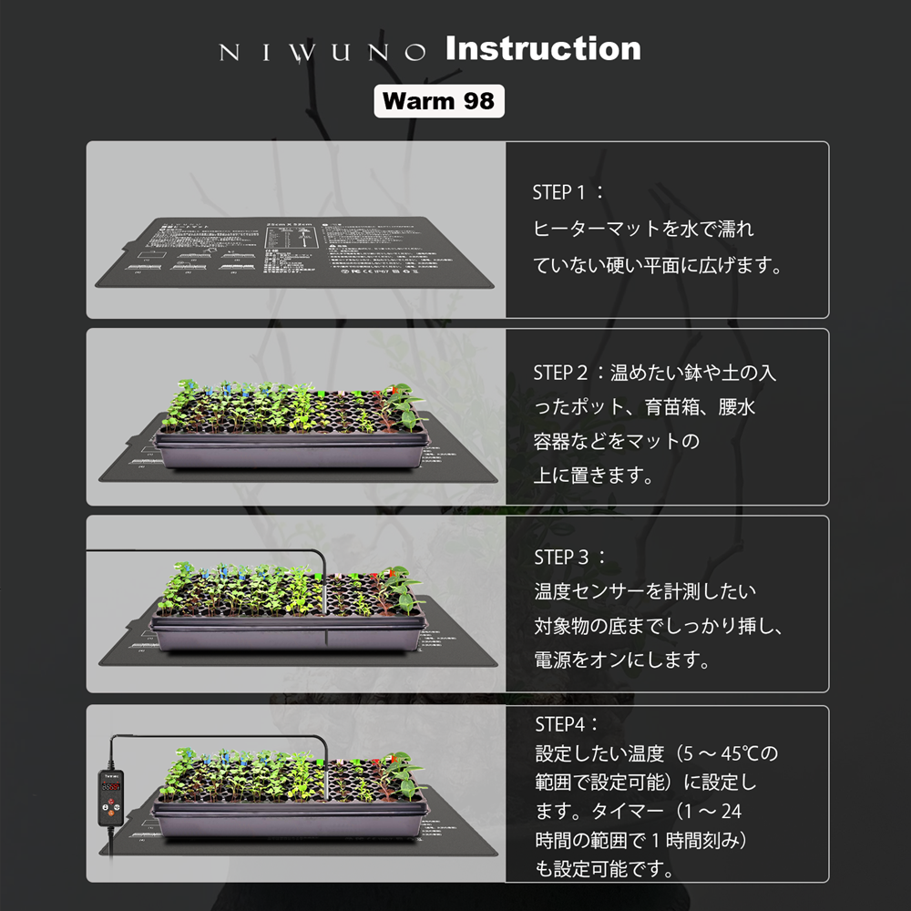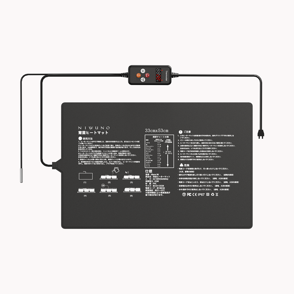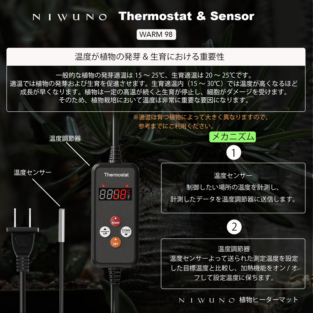Niwuno Warm98 ヒーターマットはサーモスタット機能が付いており、自動で温度調節を行うことができるため、室温に関わらず一定温度をキープ可能です。注意点として温度調節は温度センサーを利用して調節しているため、温度センサーをしっかり対象物に差し込まないと、適切に加熱することができないのでご注意ください。