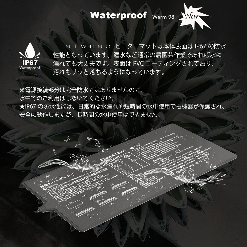 Niwuno Warm98 ヒーターマットはIP67の防水仕様なので、ヒートマットに受け皿なしで鉢を乗せたまま水やりをしても大丈夫です。鉢をわざわざ別の場所に移動して水やりをしたり、水切りなどの手間が不要でとても便利です。対象:アカべ、爬虫類、種まき、多肉植物。